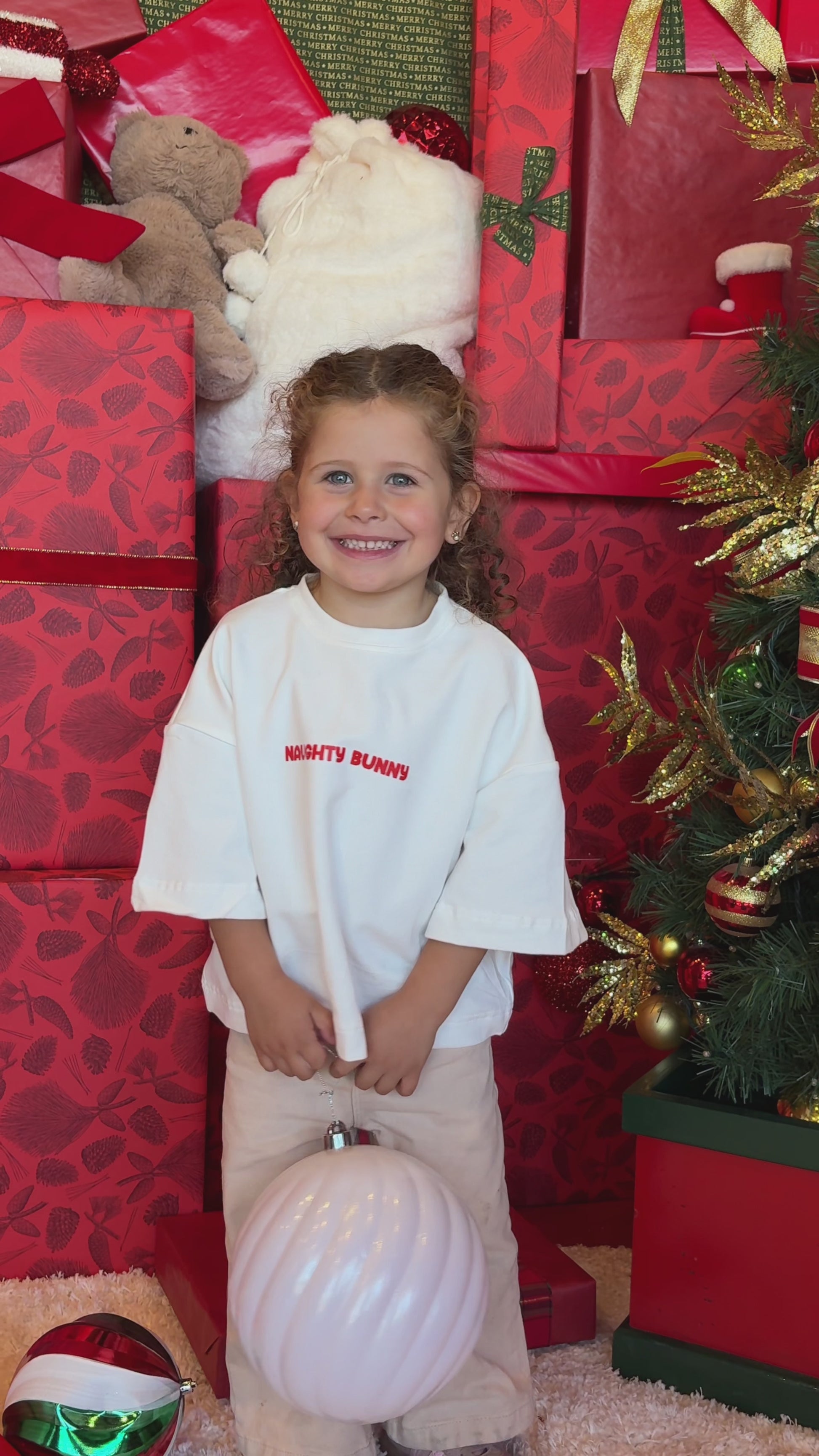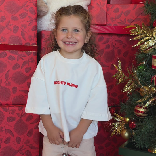 Hop into the festive season with our cheeky Naughty Bunny Kids Tee! This oversized cotton-spandex blend delivers comfort that keeps up with active play, while the playful Christmas design spreads holiday cheer. The soft, stretchy fabric moves with your little one all day long. Can't decide? Grab it as a cosy romper instead. Perfect for holiday photos, family gatherings, or just spreading mischief in style!